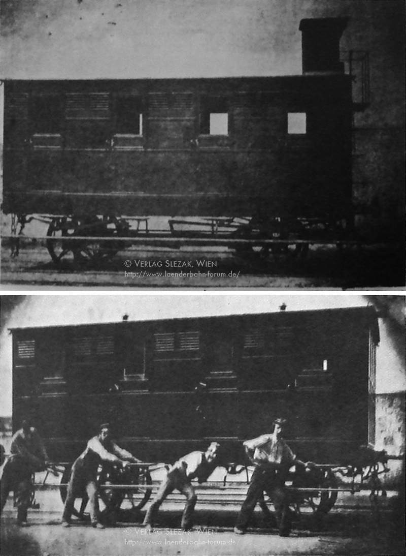 Der abgebildete Coupéwagen entspricht ebenfalls der «Bedingnis» von 1850; die Klassenbezeichnung wurde entsprechend den Vorschriften für die II. und III. Klasse in weißen, römischen Ziffern aufgebracht (I. Klasse schwarze Ziffern). Von diesem Typ Personenwagen sind uns drei Photographien[Link:Abb_12] überraschend guter Qualität überliefert, die hier wiedergegeben werden können ([12], S.99). Es handelt sich vermutlich um die ältesten Fotos österreichischer Personenwagen überhaupt, sie stammen vom Juni 1862 und zeigen je einen Wagen I., II. und III. Klasse der soeben übernommenen SStB, und tragen sämtlich noch deren Eigentumsbezeichnung. Diese Wagen sind bereits modernisiert mit neuen Achslagern und Radsätzen, einer über Laschen in die Federböcke eingehängten Federung und Schraubenkupplungen. Der Wagen mit der Bahnnummer A10 ist vermutlich gelb gestrichen, wie auch beim III.-Klasse-Wagen erkennt man die Klötze einer Feststellbremse. Der vermutlich grüne B 202 besitzt den halboffenen Bremsersitz mit den nach vorne geschwungenen Seiten, sowie als Besonderheit ein Nichtraucherabteil. Der vermutlich braune C 37 schließlich entspricht - bis auf den Bremsersitz - mit seinen Lüftungsöffnungen über den Abteiltüren exakt unserer Abbildung. Einzelne Waggons dieser Bauart hielten sich bei der Südbahn bis nach der Jahrhundertwende.